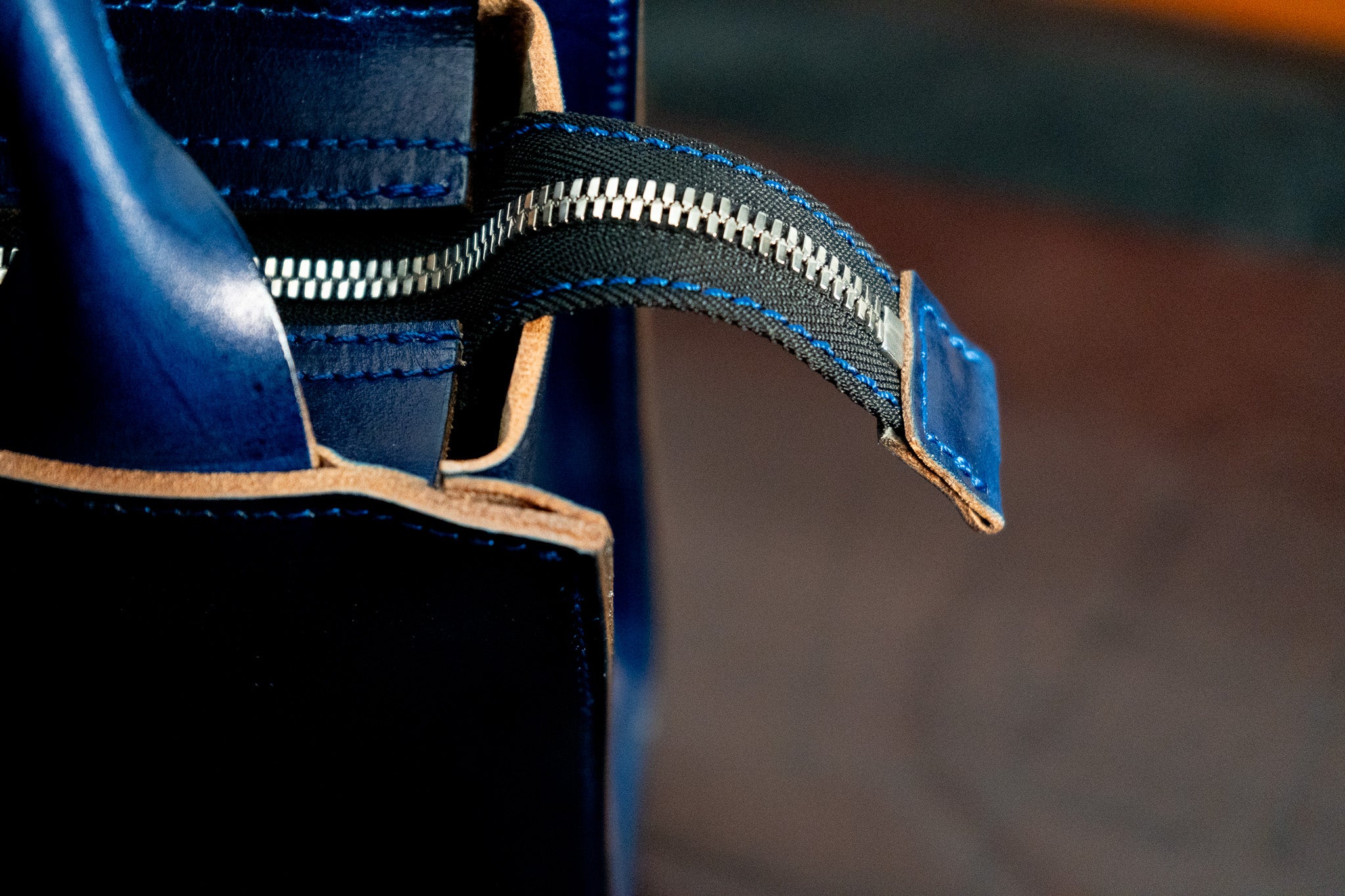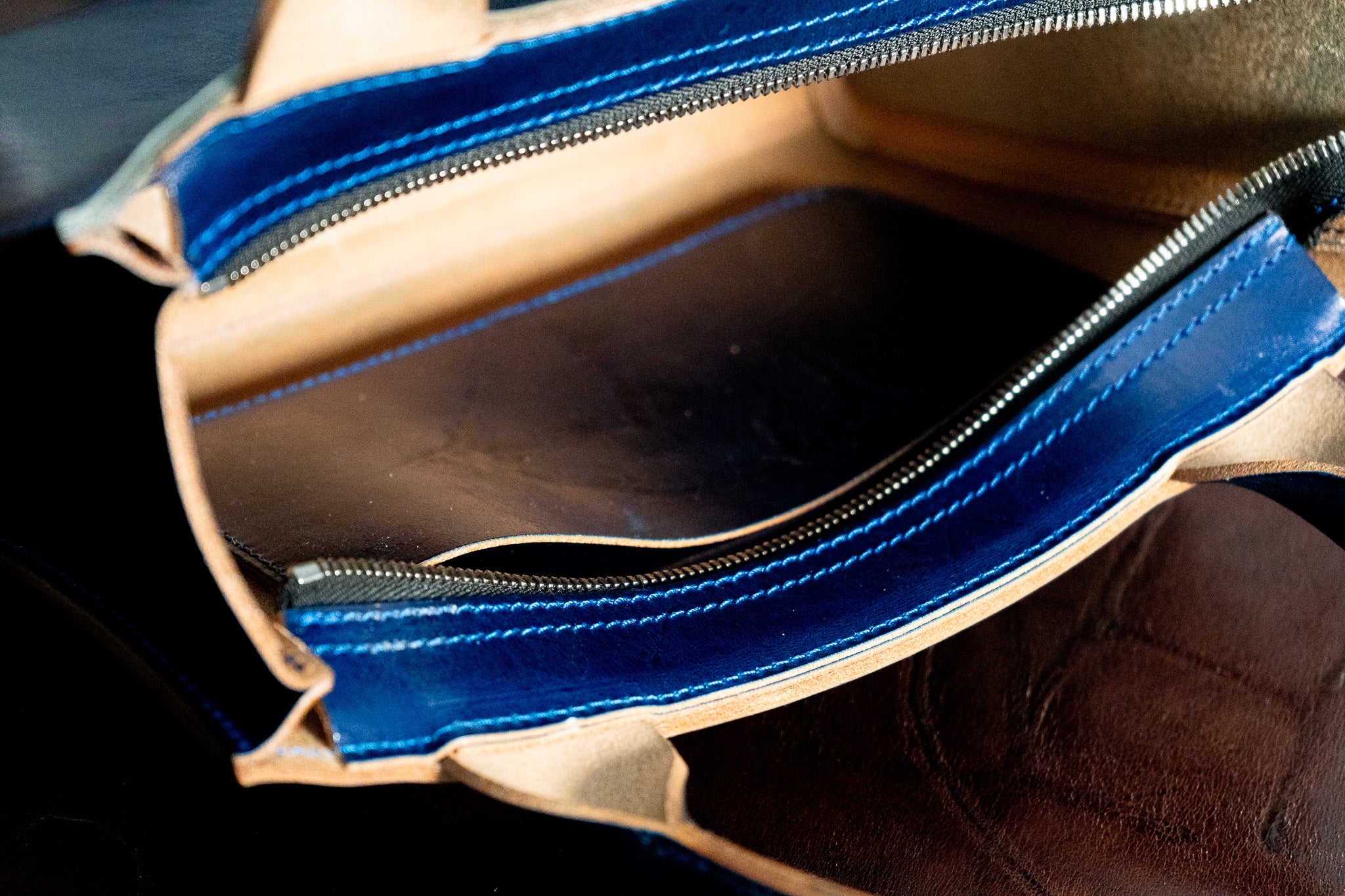 ちょうどいいサイズのマルチバッグ。マチ部分を外側に膨らませているので、収納がゆったりで500mlのペットボトルと長財布を入れてもたっぷり余裕があるサイズ感です。メインファスナーには、開閉しやすい革引手パーツを付属しています。あえて革のコバ面を見せて”革らしさ”を表現しています。
