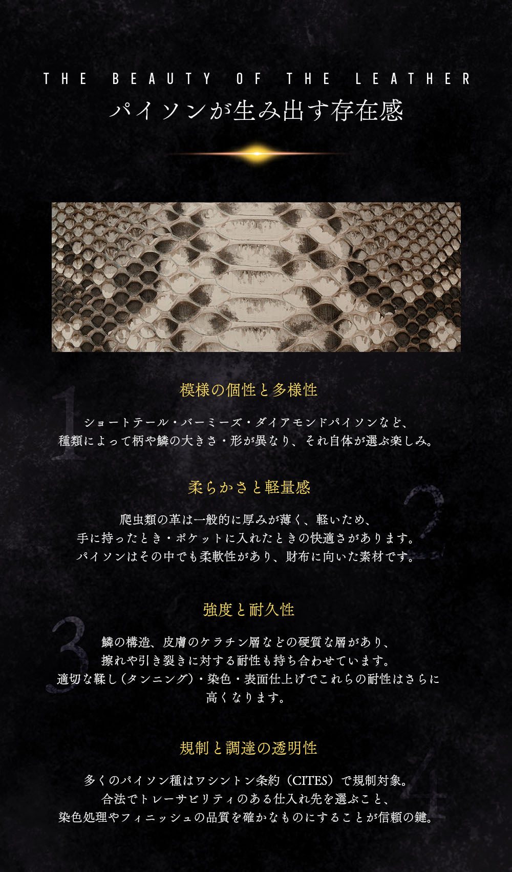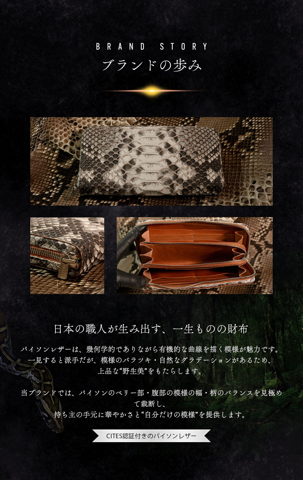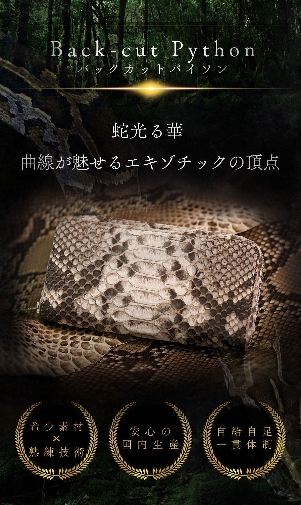 私たちのバックカットパイソン財布は、すべて名古屋の自社工房で熟練の職人が一点一点、型抜きから縫製まで丁寧に手作業で仕立てています。確かな技術とこだわりのものづくりによって、大胆さと繊細さを併せ持つ唯一無二の表情を持つ財布が生まれます。