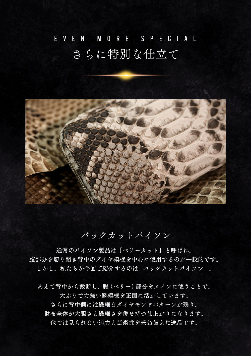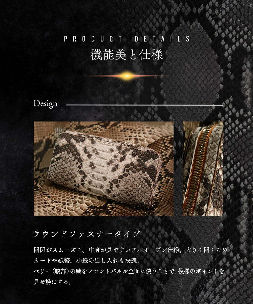 通常のパイソンレザーは背中側を中心に用いますが、バックカットパイソンはあえて背中を割り、腹部の大きく滑らかな鱗模様をメインに使用。さらに背の部分には細やかなダイヤ柄が浮かび上がり、他の革にはない独特のコントラストが楽しめます。天然の模様は一枚ごとに異なり、まさに世界にひとつだけの存在感を放つ逸品です。