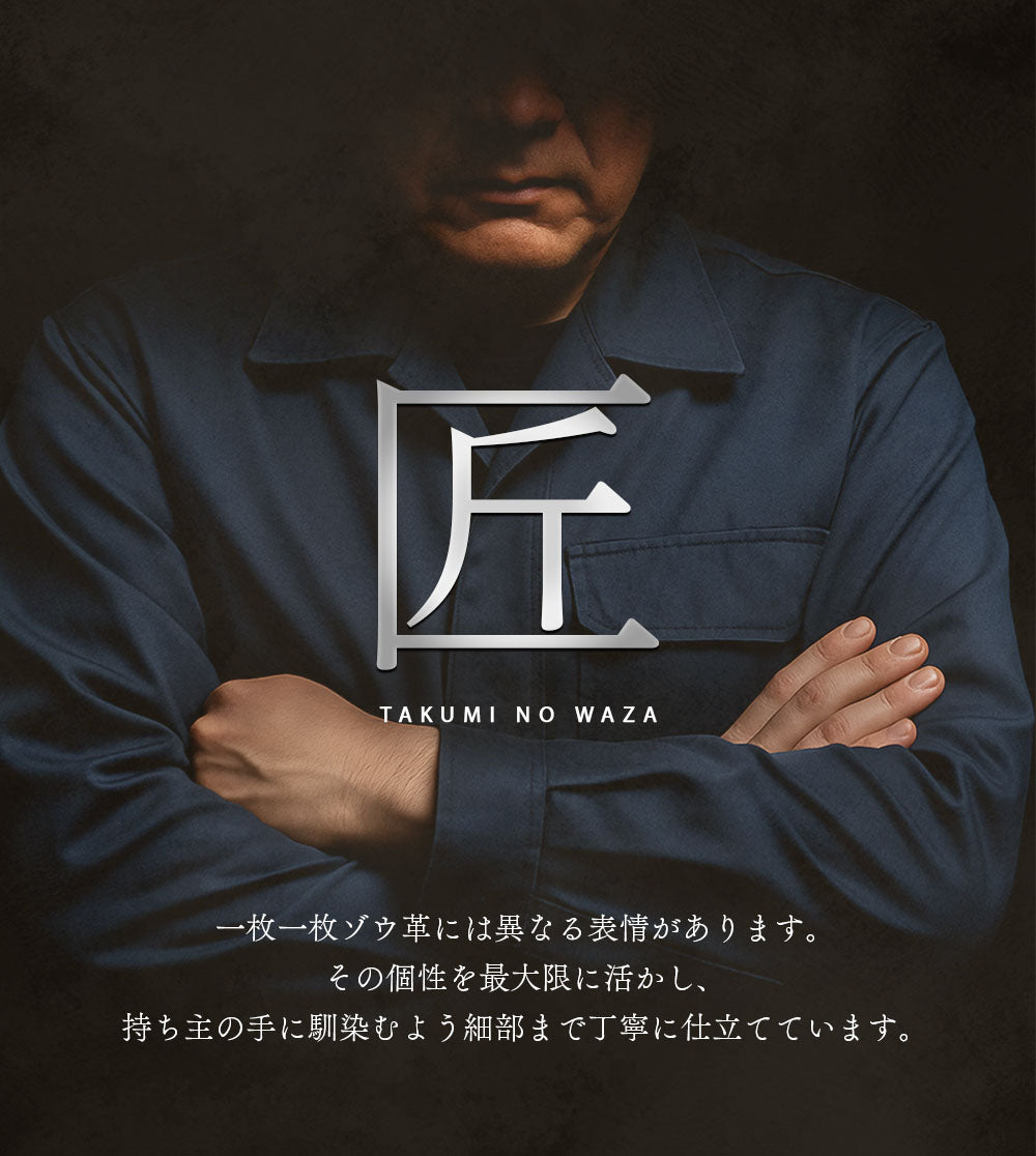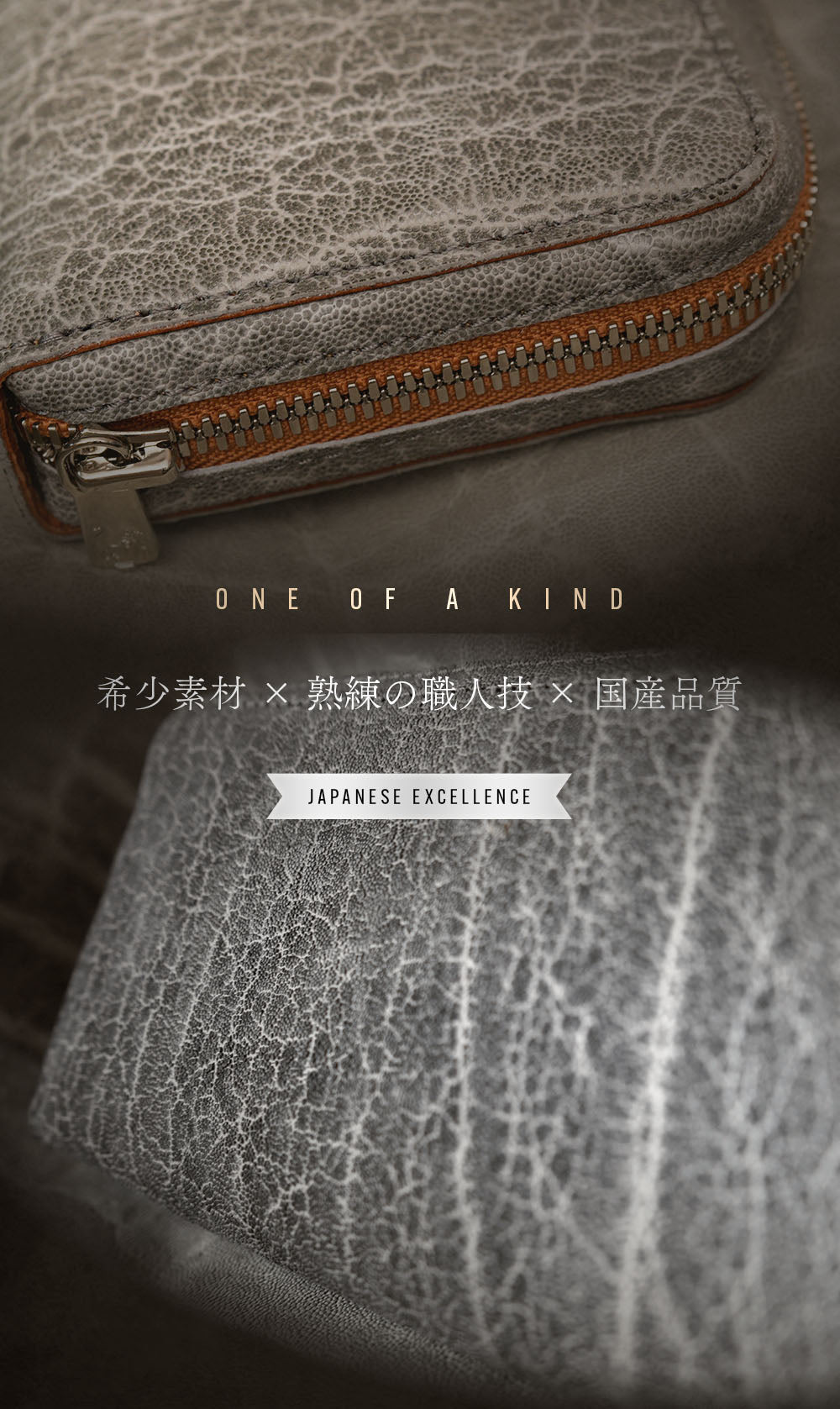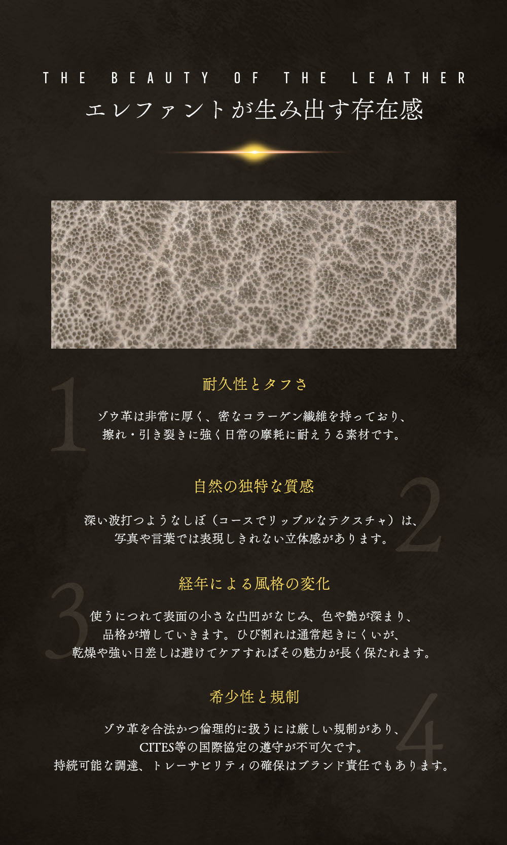 使用する革は、国際規制に基づき正規に輸入されたCITES認証付きのエレファントレザー。象革特有の深いシワ模様と堅牢さは、使うほどに味わいを増し、長年の愛用に応える強靭さを備えています。品質とトレーサビリティが保証された素材のみを扱うため、安心してお使いいただけます。