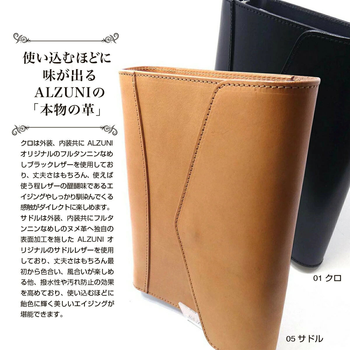 四角い形と、サイドのボタンが特徴的なALZUNIオリジナルのミニ財布。カードをまとめて入れる事により10枚?13枚の収納が可能になりミニ財布のカード入れが少ない不満を解消しました。小銭入れはボタンタイプ、ファスナータイプが選択でき、仕切り付きの札入れも完備。シンプル設計の新作モデルです。革は外装、内装共にフルタンニンなめしのALZUNIオリジナルレザーを使用しており、丈夫さはもちろんサドルレザーは最初から色合い、風合いが楽しめる他、撥水性や汚れ防止の効果を高めており、使い込むほどに飴色に輝く美しいエイジングが堪能できます。