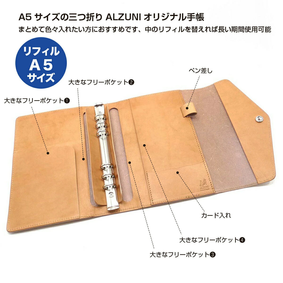 ALZUNIオリジナルのトートバック。程よいサイズ感が絶妙です。ファスナー付きのため安心してお使い頂けます。中はレザーポケット1箇所のシンプル設計。革本来の風合いがお楽しみ頂けます。底は鋲付きで置いた時の革へのダメージを抑えています。革は外装、内装共にALZUNIオリジナルのフルタンニンなめしレザーを使用しており、丈夫さはもちろん使い込むほどに美しく輝くエイジングが堪能できます。